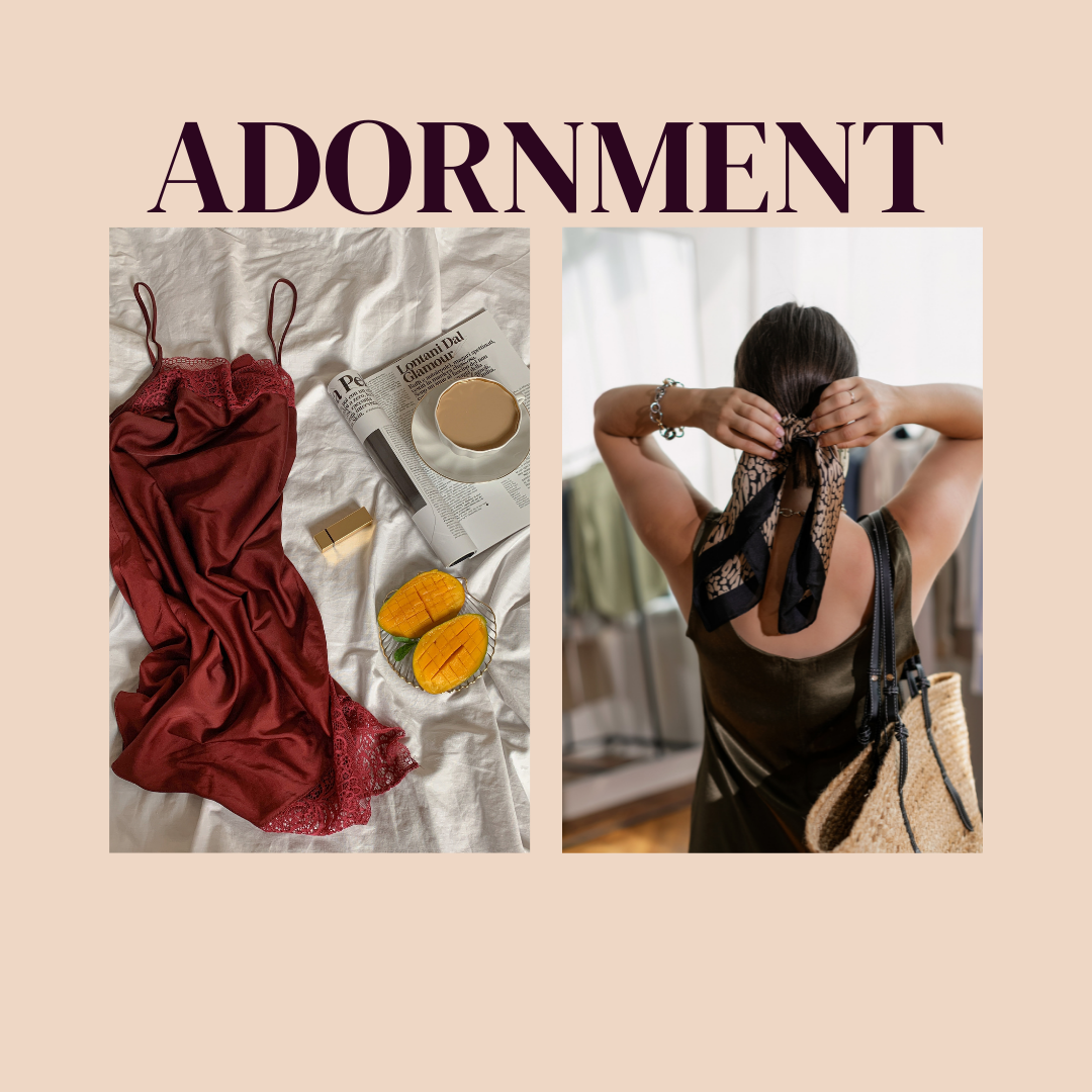 You'll be taught all about adornment—a thing which needs decorating; an ornament. We're talking jewelry, style and clothing that's made to express your true self, the one that's waiting to come out and play with sass.